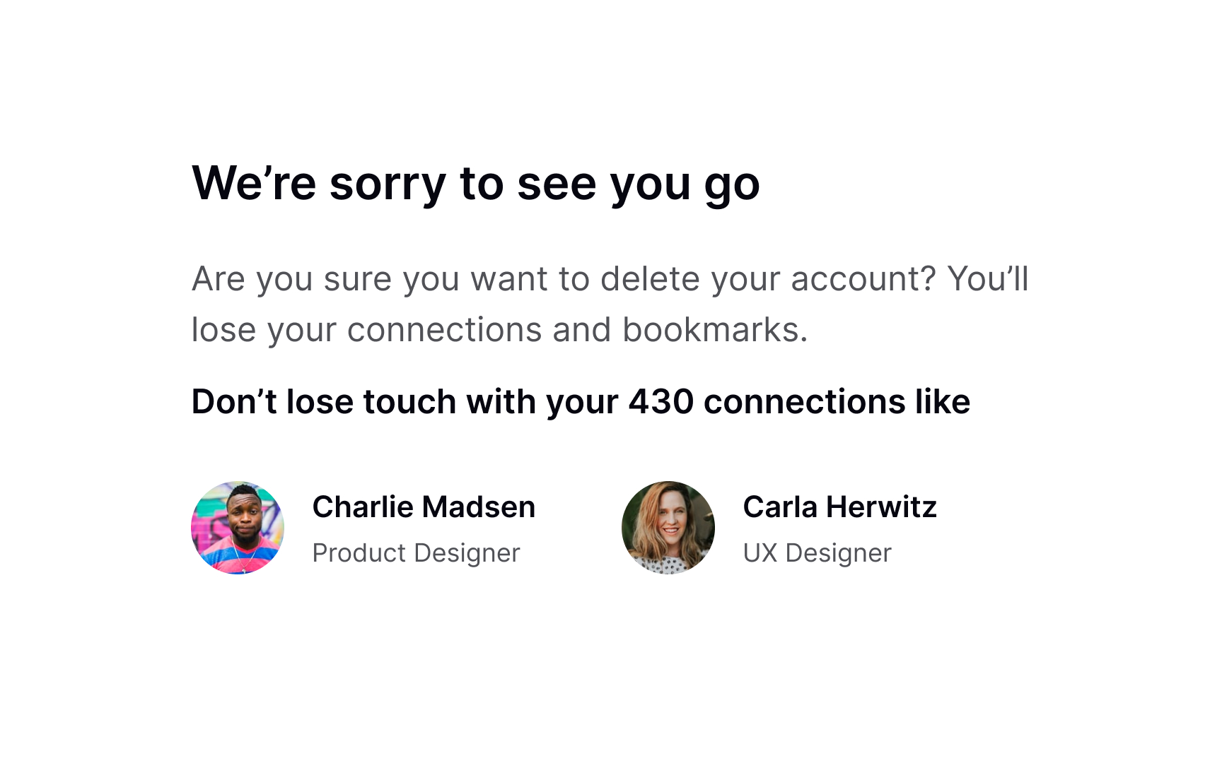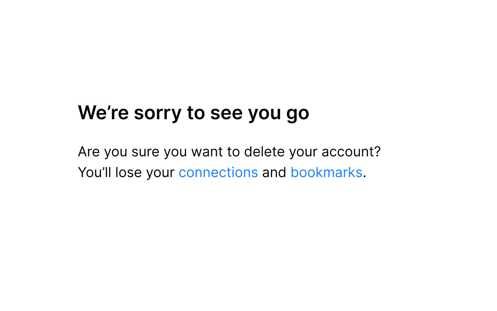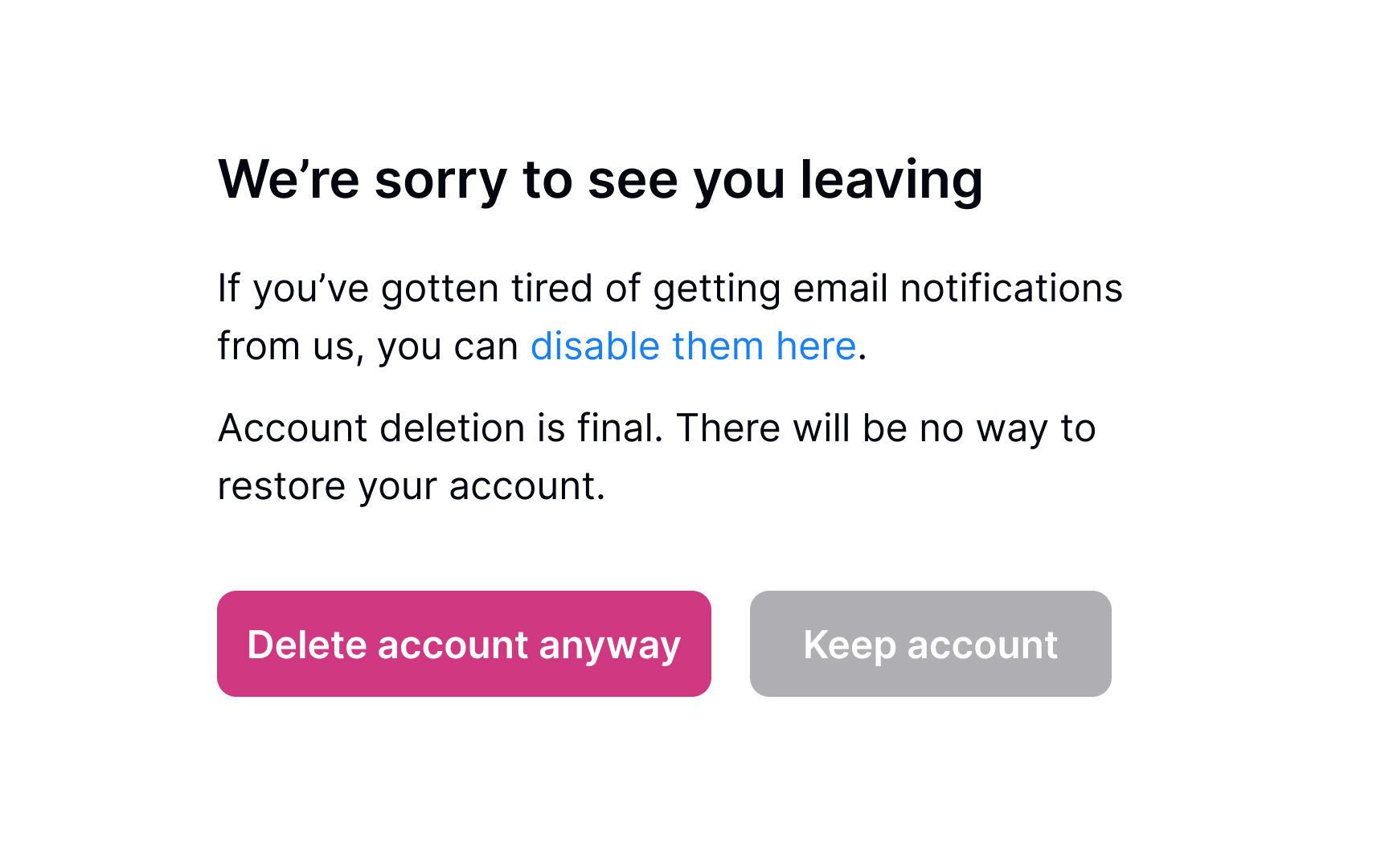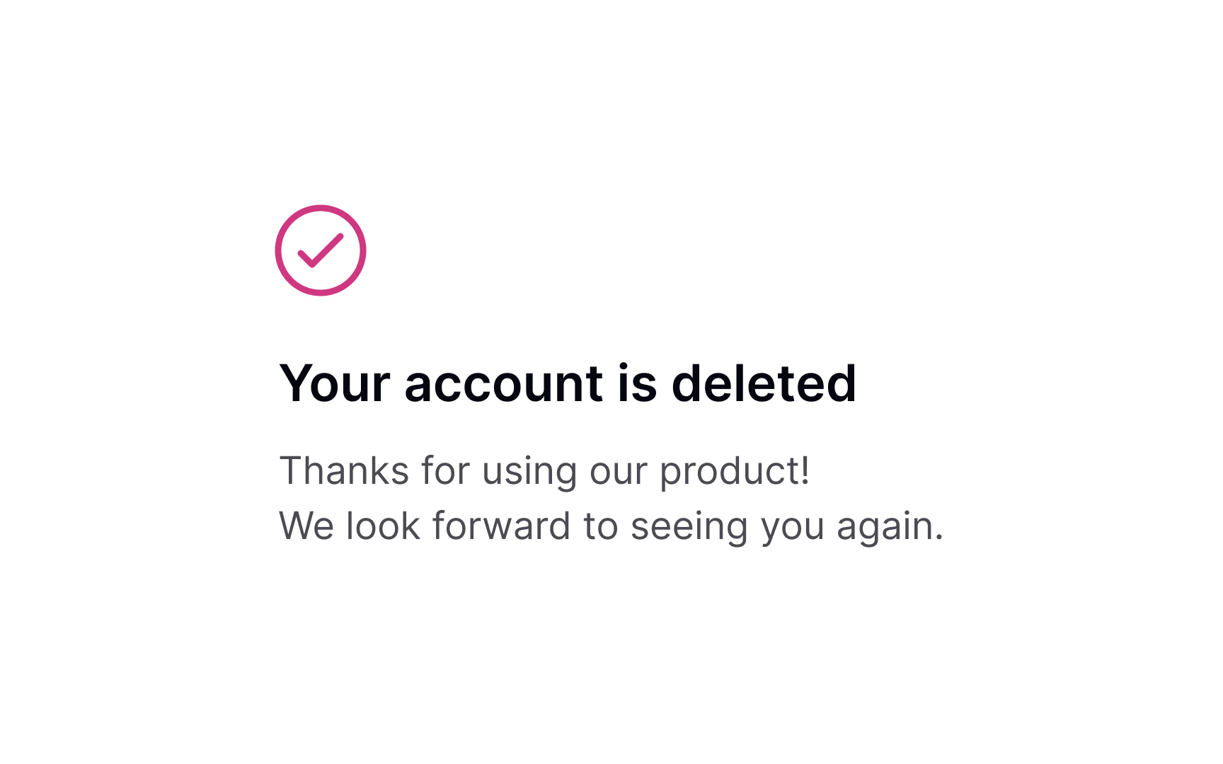 People don’t always delete accounts because they’re unhappy. Sometimes they just no longer need the service because they completed their task or found what they needed. Preserving goodwill and avoiding a blaming tone is the best policy to save your product’s reputation. It also means loyalty — users are more likely to give positive referrals in the future or come back to the product later on.