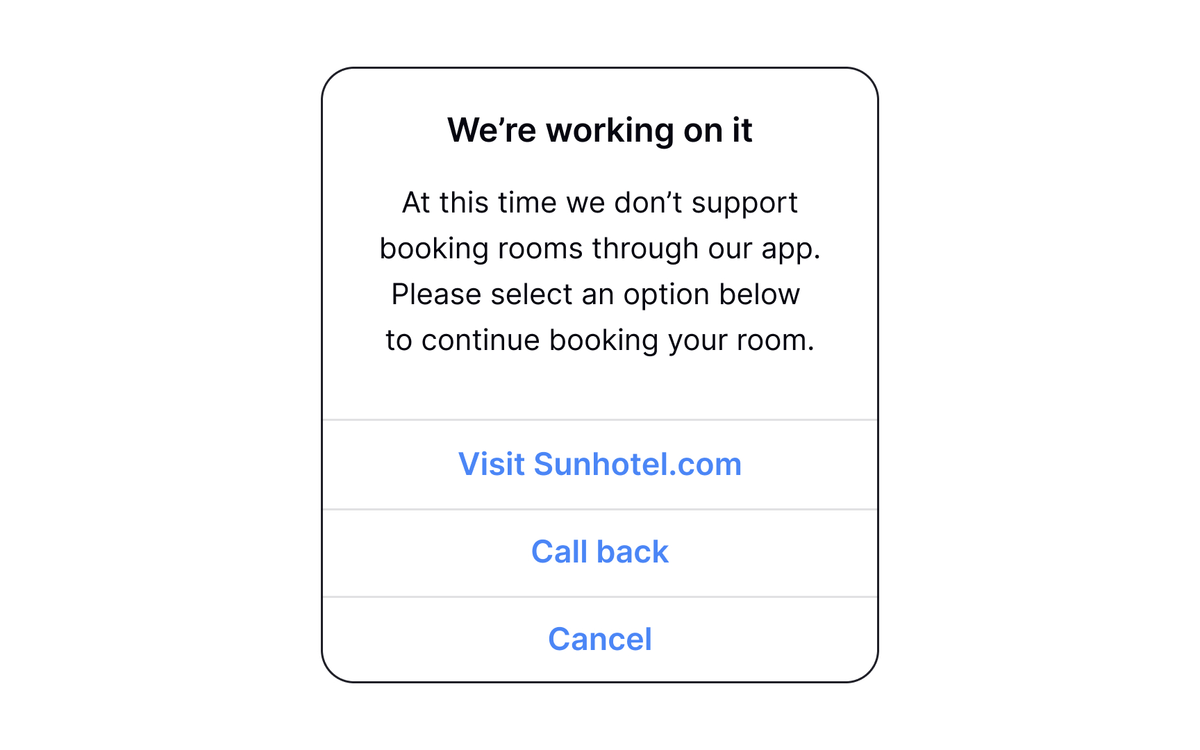 For example, if a customer can’t connect a device to an app, you can link to the F.A.Q. or a help article about connecting devices. If the function isn’t supported online, allow users to talk to a representative or offer another alternative. When creating error messages, ask yourself what the next step users can take is and how you can make it easier.
