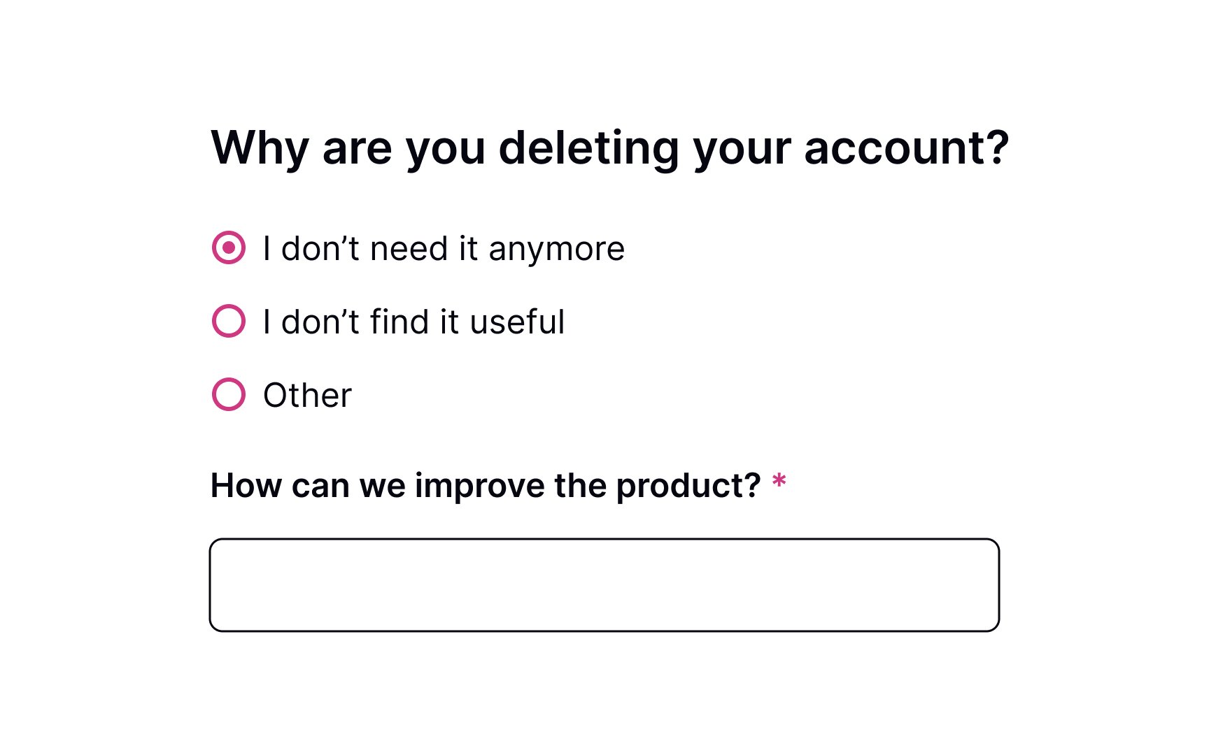 Don’t make this question mandatory and avoid pressing users to provide a detailed answer. Be polite and provide possible options for why users may want to leave. Additionally, include a section labeled “Other” that allows users to provide their own reasons for leaving in an open-ended format.